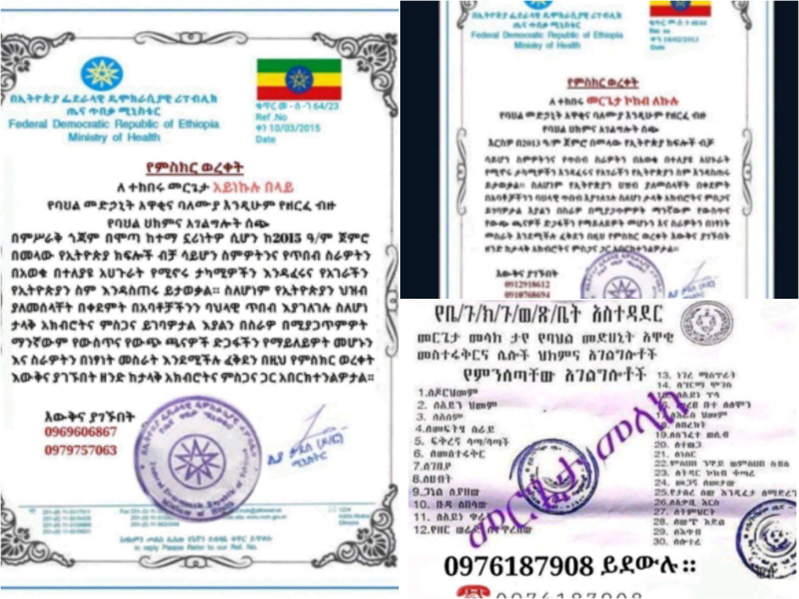 ከላይ እንደምናየው እነዚህ ሀሰተኛ የእውቅና ደብዳቤዎች ማህተም ከሌላ ቦታ በማስገባት እና ይዘቱን ወደ ልዩ ስሞቻቸው እና ስልክ ቁጥራቸው በመቀየር ይጠቀማሉ። አንዳንዴ ደግሞ በግልጽ የማይታዩ እነዚህን ዓይነት ማህተሞችንም ይጠቀማሉ።