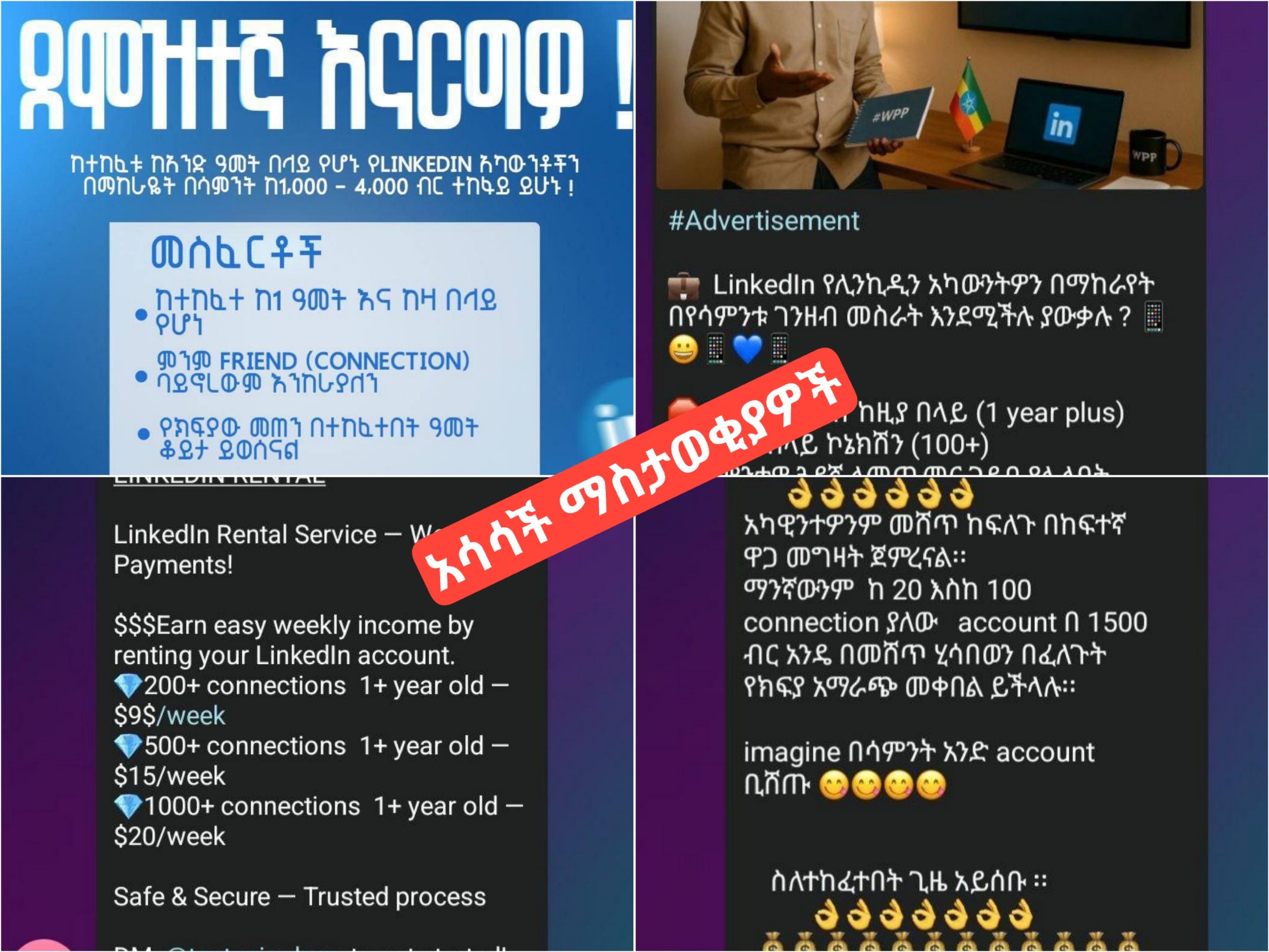 ከቅርብ ጊዜ ወዲህ የሊንክዲን አካውንትን በማከራየት በየሳምንቱ ገንዘብ ማግኘት እንደሚቻል በተለያዩ የማህበራዊ ሚዲያዎች በተለይም ደግሞ በቴሌግራም በስፋት እየተሰራጨ ይገኛል።ይህ ማስታወቂያ 100ሺህ እና ከዛ በላይ ተከታይ ባላቸው የቴሌግራም ቻናሎችም ጭምር በስፋት እየተዋወቀ ይገኛል።