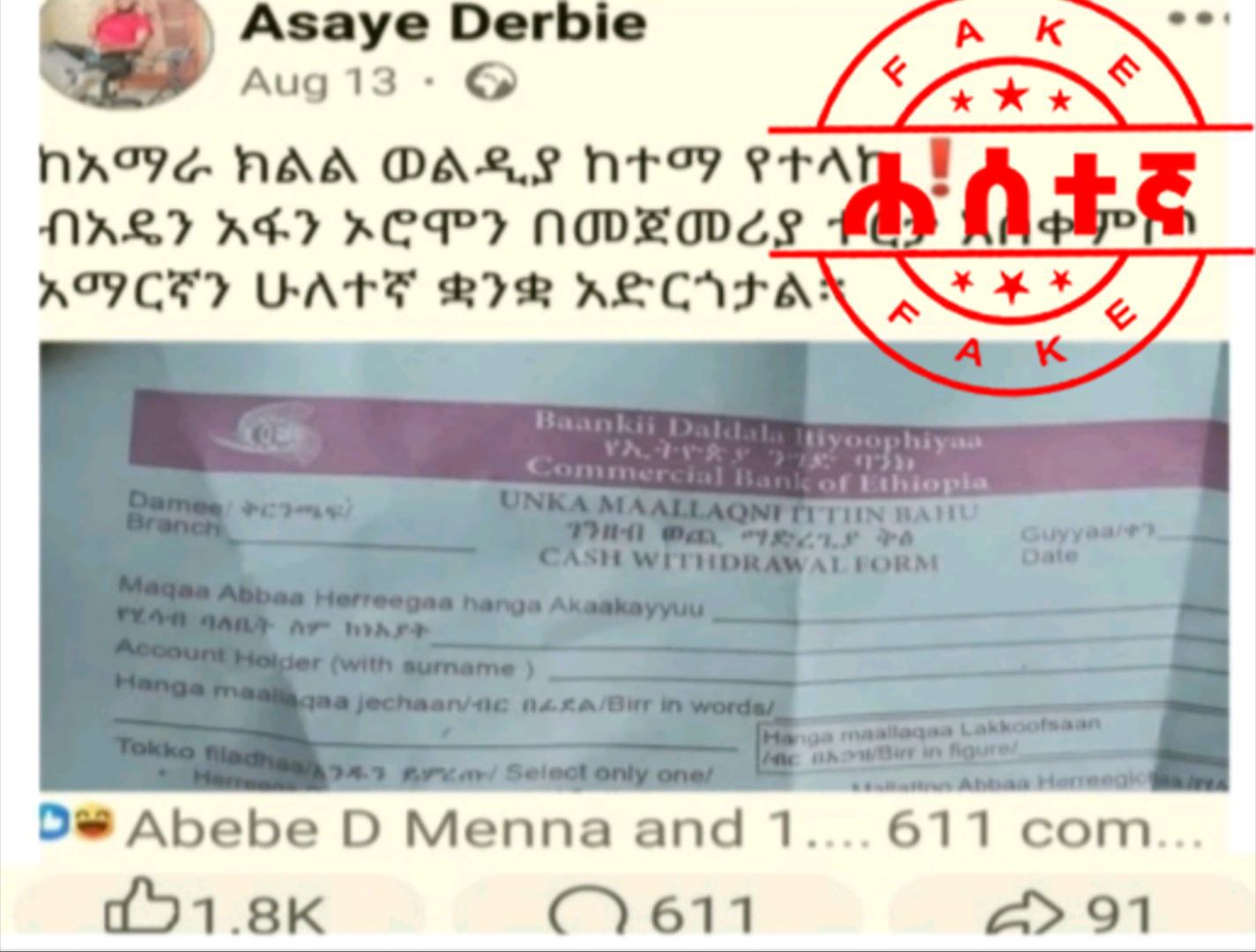 ከላይ በምስሉ እንደሚታየው የኢትዮጵያ ንግድ ባንክ የኦሮምኛ ቋንቋ መጀመሪያ ላይ አስቀምጦ በሁለተኛ ደረጃ የአማርኛ ቋንቋን በማስቀመጥ ደንበኞች የሚፈልጉትን አገልግሎት በዚህ ደረሰኝ አማካኝነት እንዲያገኙ ማድረጉ ይታወሳል። ይህ ደረሰኝም ከአማሪ ክልል ወልድያ ከተማ ከሚገኙ የፌስቡክ ገፅ ተከታዮቼ የተላከልኝ ነው በሚል በርካታ ተከታዮች ያሉት አሳየ ደርቤ የተባለ አክቲቪስት ደረሰኙን ለተከታዮቹ አጋርቷል። አክቲቪስቱ ከ229 ሺህ በላይ ተከታዮች ሲኖሩት ያጋራው የተሳሳተ መረጃ መረጃው ሲዘጋጅ ከ1800 በላይ ላይክ፣ 611 ኮሜንቶች ሲሰጡ 92 ሰዎች ፅሁፉን አጋርተውታል።