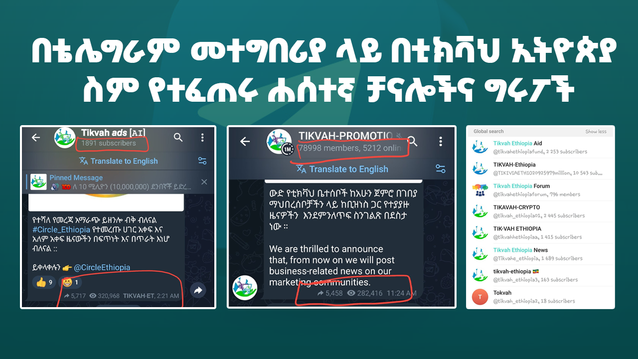 ከላይ የምትመለከቷቸው ምስሎች በቴሌግራም መተግበሪያ ላይ የሚገኙ ሀሰተኛ ገጾች ሲሆኑ፤ በተለይም የቴሌግራም ግሩፖችን በስፋት ይጠቀማሉ፡፡ ስያሜውን በተመለከተም ቲክቫህ ከሚለው ስም ቀጥሎ ልክ በትክክለኞቹ ቻናሎች ይዘት ነክ ስያሜዎች እንደሚሰጣቸው ሁሉ ተመሰሳይ መንገድ በመጠቀም ሌሎች ስያሜዎችን አስከትለው የተፈጠሩ ናቸው፡፡