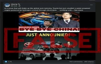 የተሰራጨው ሀሰተኛ መረጃ የዓለማችን ትልቁ የመኪና አምራች የሆነው ቶዮታ በዓይነቱ ልዩ የሆነ ሞተር ውሃን እንደ ነዳጅ የሚጠቀም እና የሊቲየም ባትሪዎችን ወይም ቻርጅ ማድረጊያ ጣቢያዎችን እንደሚያስወግድያትታል። በተጨማሪም ዓለም አቀፉን የአውቶሞቢሎች ኢንዱስትሪ በሚያናውጥ እርምጃ ቶዮታ በኤሌክትሮላይዝስ አማካኝነት የሚፈጠረውን የውሃ ተንቀሳቃሽ ሞተርን በሃይድሮጅን የሚንቀሳቀስ የውሃ ትነት ብቻ ይፋ አድርጓል ይላል። ነገር ግን ቶዮታ ለ AFP Fact Check ዘገባው ውሸት መሆኑን ተናግሯል። ባለሙያዎችም ይህ ጽንሰ-ሐሳብ እጅግ በጣም ውጤታማ እና በተግባር ግንየማይሰራ መሆኑን ጠቁመዋል።