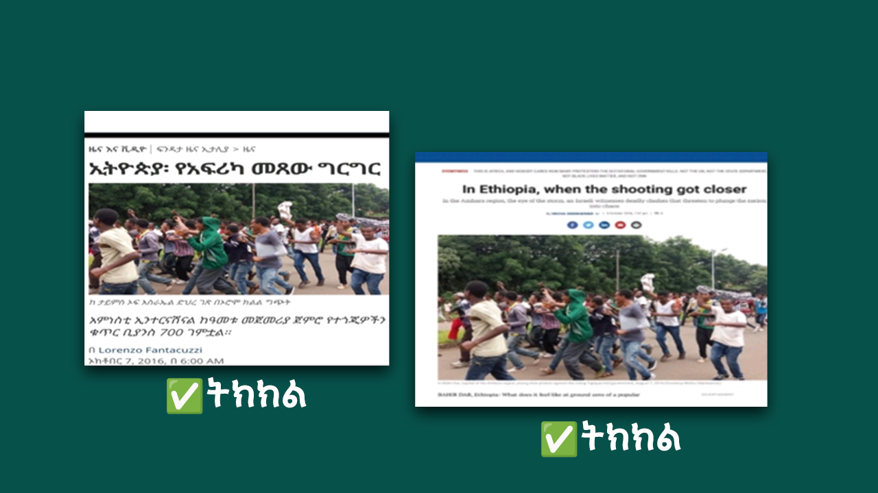 መረጃዎችን ለማረጋገጥ Google reverse image፣ Tineye reverse image እና Bing reverse image ጥቅም ላይ ውለዋል።