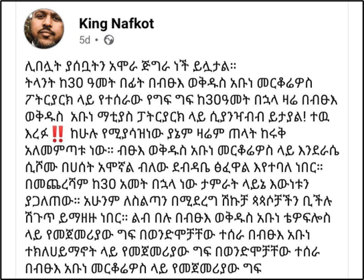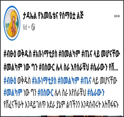 በመስከረም ወር በተለያዩ የማህበራዊ ትስስር ገጾች በስፋት ከተሠራጩ ሀሰተኛ መረጃዎች መካከል የኢትዮጵያ ኦርቶዶክስ ተዋሕዶ ቤተክርስቲያን ቅዱስ ፓትርያርክን በተመለከተ ሲዘዋወር የነበረው መረጃ ተጠቃሹ ነው።ብጹዕ ወቅዱስ አቡነ ማቲያስ ቀዳማዊ ፓትርያርክ ርዕሰ ሊቃነ ጳጳሳት ዘኢትዮጵያ ሊቀ ጳጳስ ዘአክሱም ወእጨጌ ዘመንበረ ተክለሃይማኖት የጤና ችግር ስለገጠማቸው ሌላ ሰው እንዲሾም ጥያቄ አቀረቡ በሚል በተለያዩ የማህበራዊ ትስስር መንገዶች በስፋት ሲዘዋወር የነበረን መረጃ በመስከረም ወር በስፋት ታዝበናል። ከቅዱስነታቸው የመልቀቅ ካለዚያም አቃቢ መንበር እንዲሾም ከመጠየቃቸው ጋር በተያያዘም ከጀርባ ሌላ ፖለቲካዊ ግፊት እንዳለ የይሆናል መላ ምቶችም አብረው ተዘዋውረዋል።ይህን ጉዳይ ለታዳሚዎች ካደረሡ አካላት መካከል በyoutube ከ150ሽ በላይ ተከታይ ያለው EOT React የተሰኘ ቻናል ተጠቃሹ ነው።