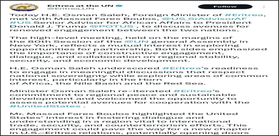 የተጠቀሱት ባለስልጣን ከኢትዮጵያ ቆይታቸው በኋላ ከኤርትራ ባለስልጣናት ጋር መምከራቸውም በተለያዩ መገናኛ ብዙሃን ተዘግቧል።ይህን ጉዳይ ኤርትራም በተባበሩት መንግስታት ድርጅት አምባሳደሯ የ x አካውንት በኩል ገልጻለች።