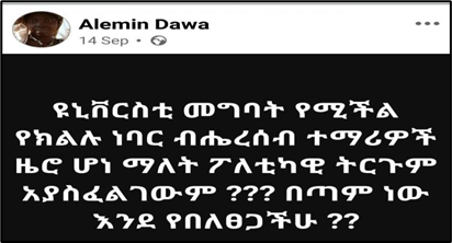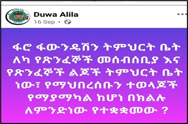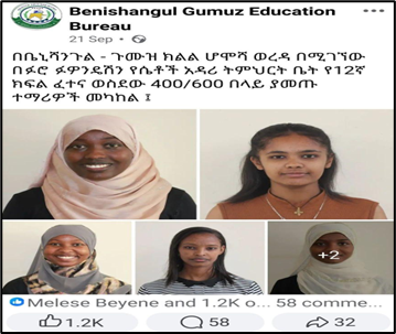 Duwa Alila እና Alemin Dawa በተባሉ የፌስቡክ ገጾች ላይ ትምህርት ቤቱ በክልሉ የሚገኙ ነባር ብሔረሰቦች ማለትም ቤኒሻንጉል ፤ጉሙዝ፤ ሺናሻ፤ ማኦ እና ኮሞ የተባሉ ብሔረሰቦችን እያስተማረ እንዳልሆነ ወይም እንዳገለላቸው አድርገው ሃሰተኛ መረጃዎችን አሰራጭተዋል።