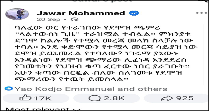 ይህን መረጃ መጀመሪያ የተመለከትነው ጀዋር መሀመድ 3ሚሊዮን ተከታይ ባለው የፌስቡክ ገጹ እና በ <X> ገጹ ላይ ነው። ይህ ግለሰብ ደግሞ በብዛት በውስጥ መስመር የደረሰኝ መረጃ ነው በማለት በርካታ ትክክለኛነታቸው ያልተረጋገጡ በተለይ ገዥውን መንግስት የሚተቹ መረጃዎችን ሲያጋራ እንመለከታለን ፡፡