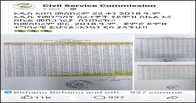 በኋላ ላይ ደግሞ መንግስት ከመስከረም ወር 2018 ዓ/ም ጀምሮ ለመንግስት ሰራተኞች አድርጋለሁ ያለውን የደሞዝ ጭማሪ ነባር ደሞዝና አዲሱን ደሞዝ እንዲሁም ግብር እና ጡረታ ተቆርጦ ካሽ የሚደርሰውን ደሞዝ የሚገልጽ መረጃ ህጋዊ በሆነ መንገድ አሳውቋል ፡፡