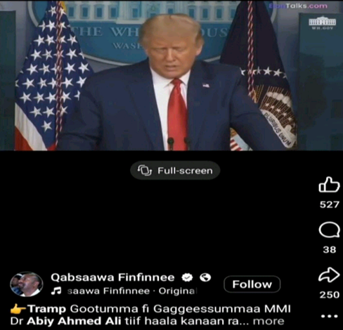 የ46 ሰከንድ ርዝመት ያለው ቪድዮ ላይ ትራምፕ "ኢትዮጵያውያን እንኳን ደስ አላችሁ... [በጠ/ሚር አብይ] ላይ እንተማመናለን። የተጀመሩትን በማፋጠን እና በትናንሽ እና መለስተኛ ዘርፎች ላይ ዜጎች ተጠቃሚ እንዲሆኑ አድርገዋል። በዶ/ር አብይ አህመድ የሚመራው የኢትዮጵያ መንግስት በተለይ በጭስ አልባ ኢንደስትሪው ዘርፍ የሚያስገርም ስራ እየሰራ ነው። ቆንጆ እና ንፁህ ሀገር እየመሩ ያሉ መሪ ናቸው" ሲሉ ይደመጣል።(የተሳሳተ መረጃ ቪዲዮ ሊንክ :https://www.facebook.com/share/v/1AMjztUkQZ/)